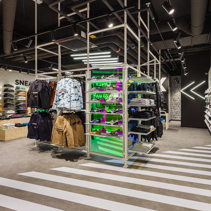 It is clear that the shop in the Cano shopping mall in Singen is about more than just shoes. It’s more about style and attitude. The streetwear boutique is self-confident with graphic block patterns, fluorescent tubes and punctual bright color accents. Those who shop here value their clothes. Those who shop here show their attitude.