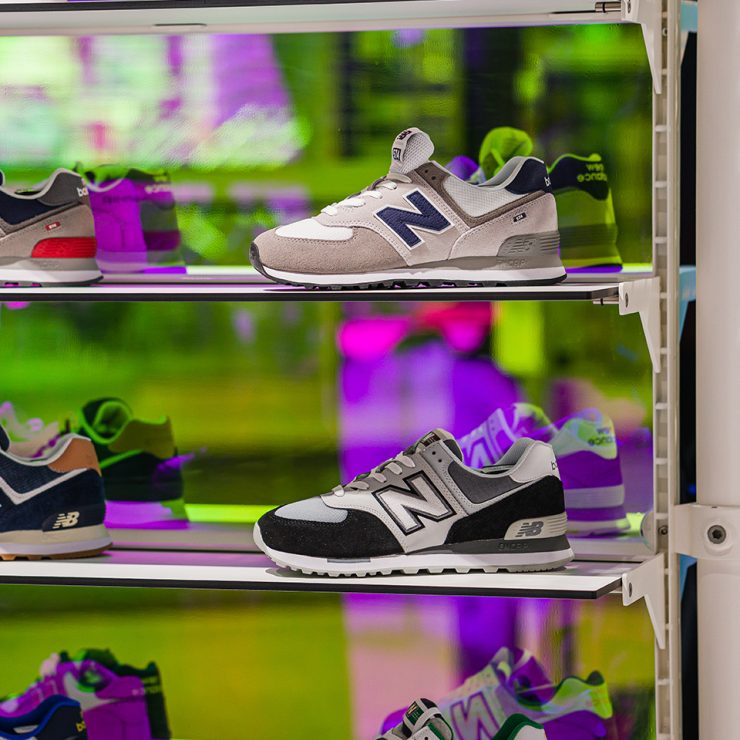 On the long shoe wall made of white expanded metal, a single shoe is enthroned on a simple shelf. The black ceiling and the black wall facing the changing rooms and the warehouse (there is space for over 3000 shoeboxes here) create a calming contrast to the brightly colored Plexiglas panes and the colorful fashion.