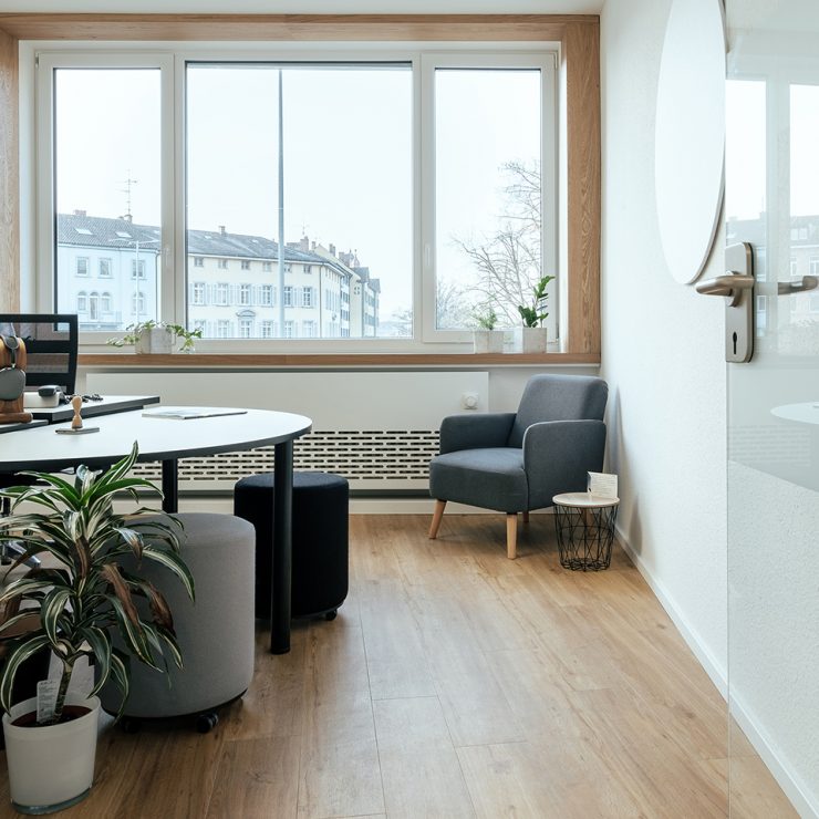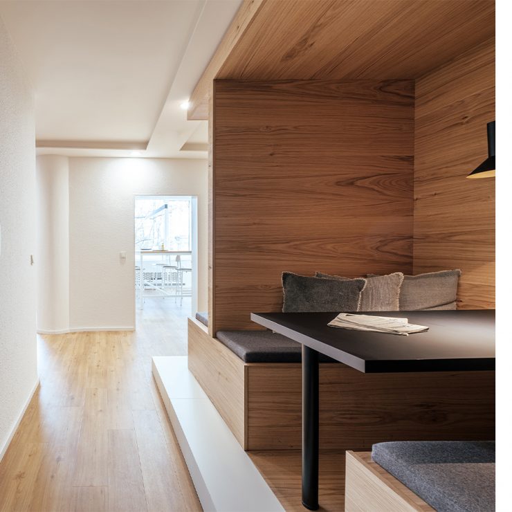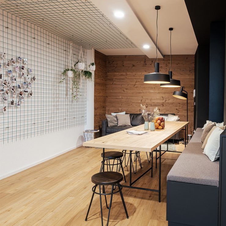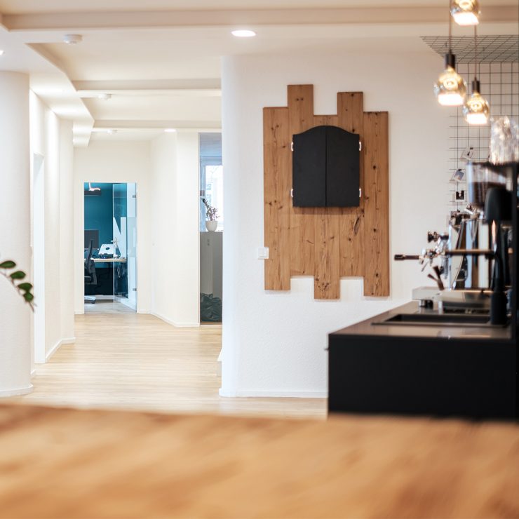 This is how the briefing of the agency W3 digital brands from Constance on Lake Constance could be summed up in a few words. What we made of it corresponds exactly to that. Based on the corporate design of W3 and its digital playground, the room concept is based on clear lines, restrained colors and tactile textures. In the agency rooms there are old wood planks on the walls, next to a plain black coffee kitchen. Knotty oak and gray felt upholstery decorate the seating niches – you like to go there when you want some peace and quiet. In contrast, the central counter, again made of old wood, invites you to socialize with freshly tapped after-work beer. A blue grid, which runs over the ceiling and wall in the seating area and is used as a memogrid, associates the digital design grid, while the acoustically effective round felt pads on the walls take up the W3 company logo.