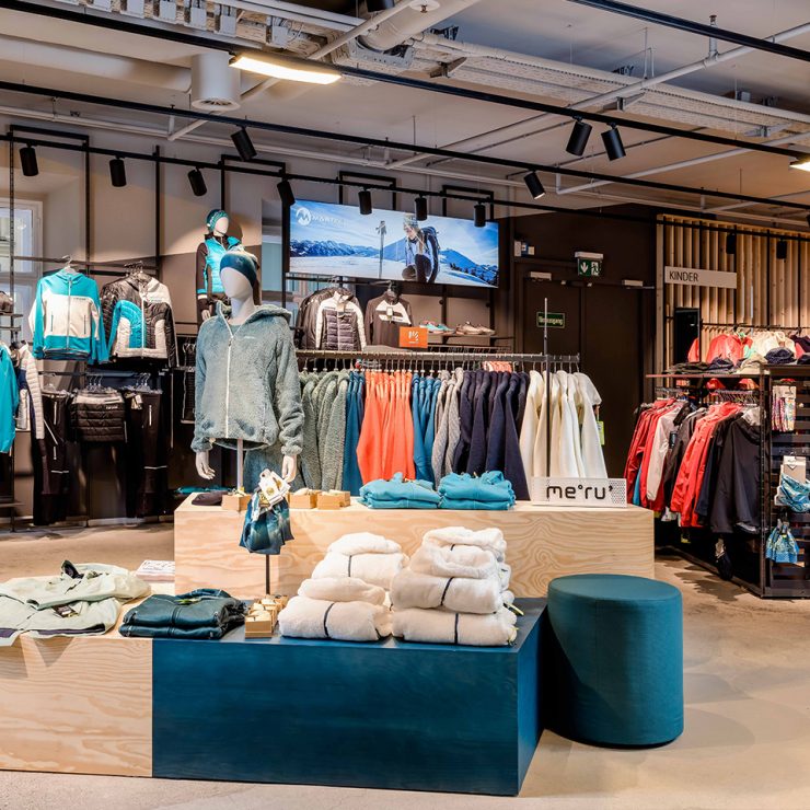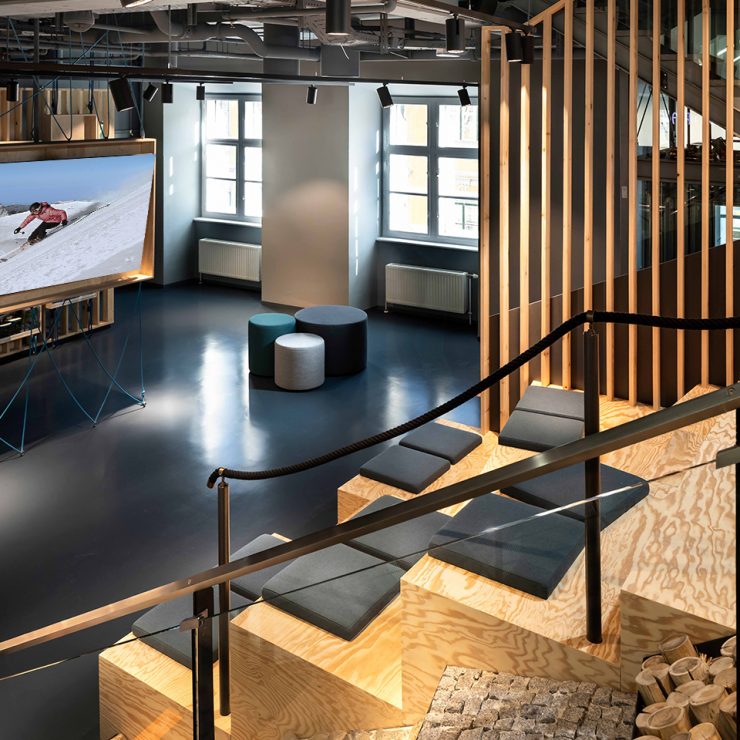 A building complex in downtown Graz. Four houses, different heights, unclear entrances and crossings. The aim in the new planning of the nearly 7,000 square meters of sports store was to optimize the orientation for customers with a consistent design concept and to create a unique environment.