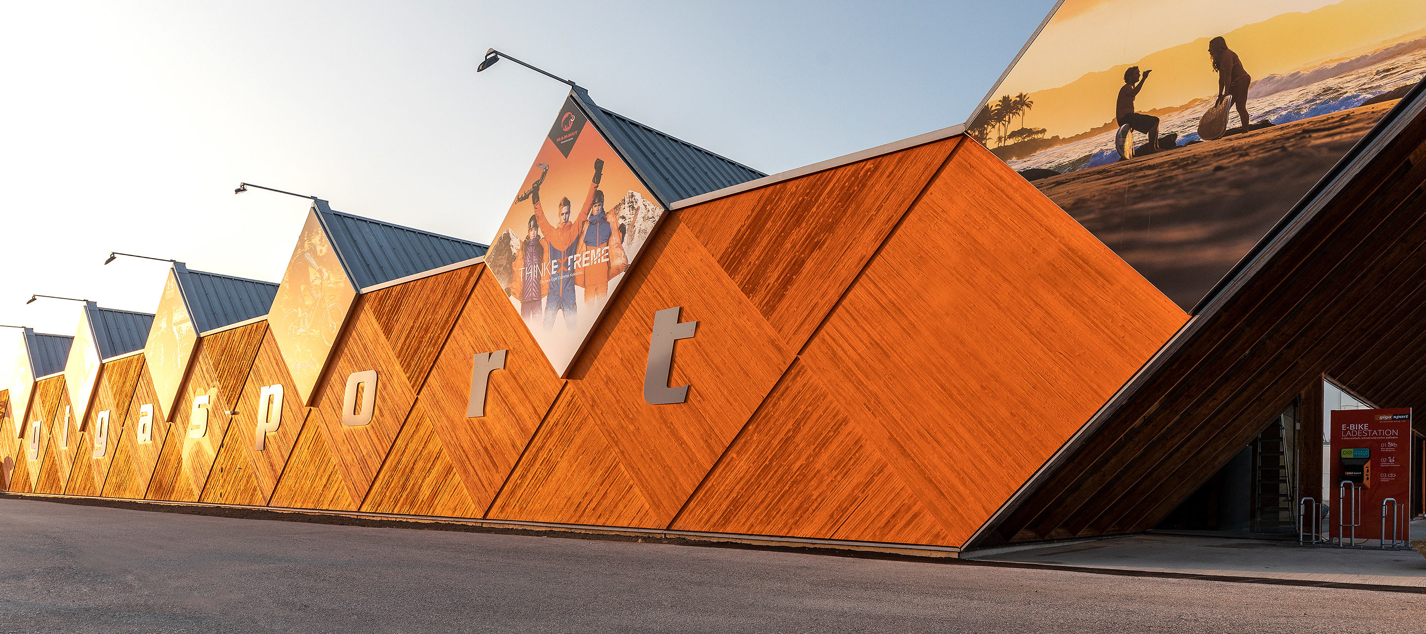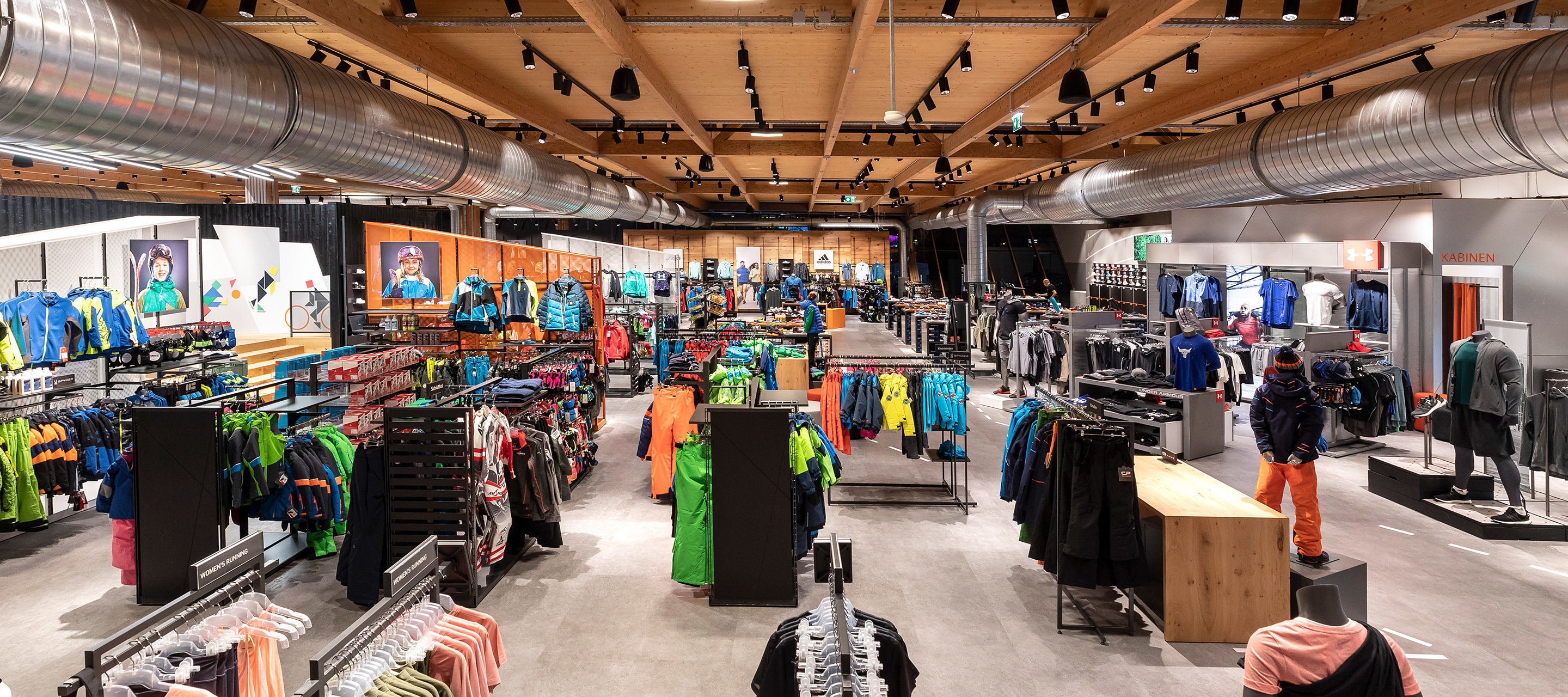 At Gigasport in Brunn am Gebirge, sport is number one and so the standards were high to reflect this when it came to redesigning the 4000 m² store. From the wide range of attributes which arose during the briefing, two were taken on board and were encapsulated in the design proposed by the planners from Konrad Knoblauch GmbH: creating spaces and exclusivity. The existing corporate design and striking architecture of the building, which is around 20 years old, was also actively integrated into the design. The Gigasport colours are reflected in the design and the 60° slope, which represents the typical character of the building, was also integrated into the spatial design. This allowed the dynamic structure of the building and resulting influx of light to be emphasised and brought into harmony with the visible roof structure and ventilation pipes.