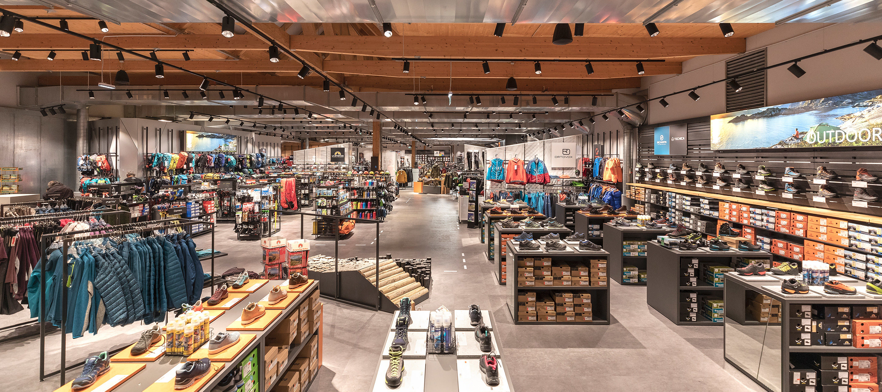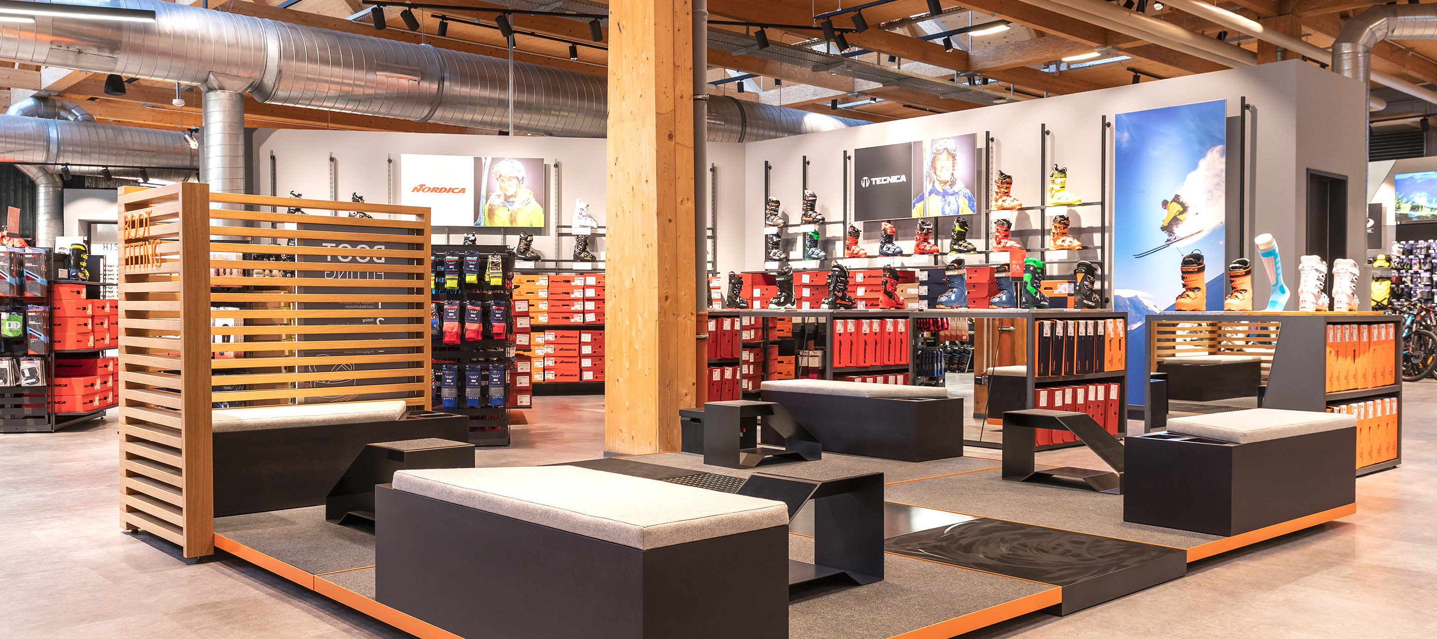 At Gigasport, this theme is conveyed through an overall sense of harmony and higher-level service concept. The materials selected radiate high quality and a rugged composition: silver painted OSB panels, shiny black spruce wood, non-slip structured materials, black and orange lattice walls and wooden slats. The arrangement is topped off with elements taken from the product portfolio and elements re-organised as a result of the redevelopment – a concrete look flooring, visible roof structures and ventilation pipes. The front of the counter in the service area is covered with a thick and wave-shaped layer of rubber – in addition to its visual effect, the front also serves as a bike or ski stand.
