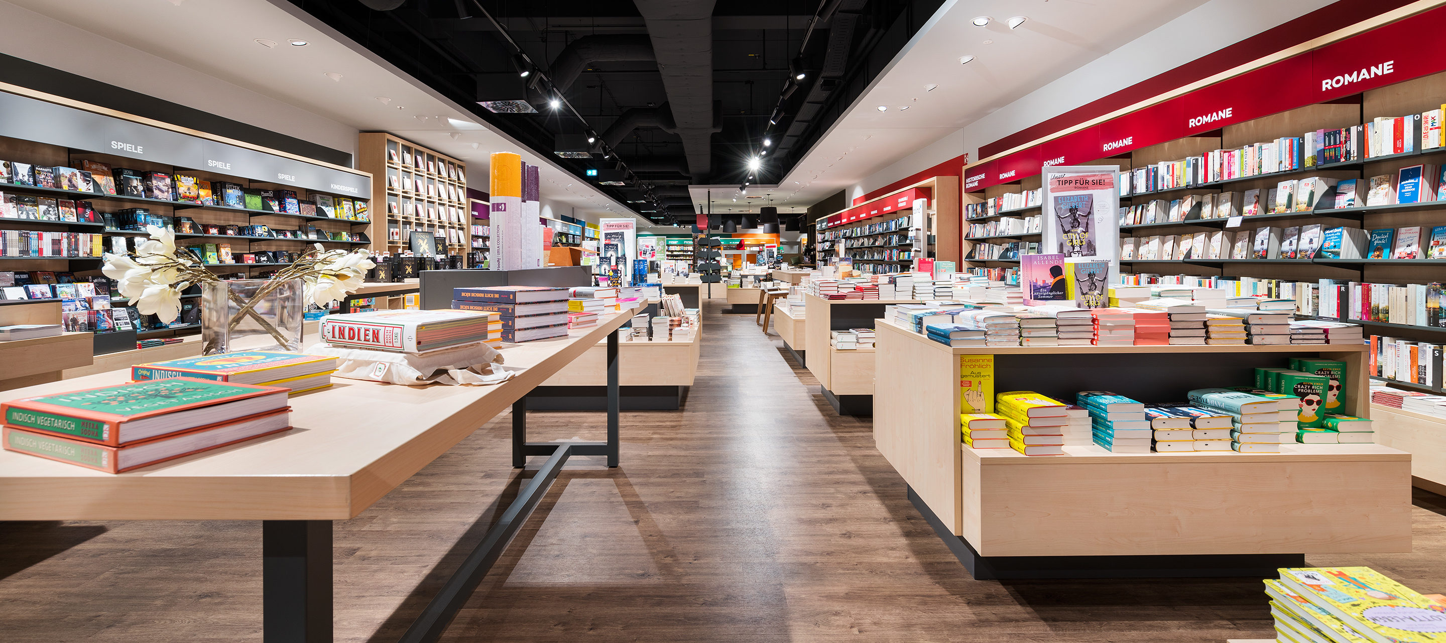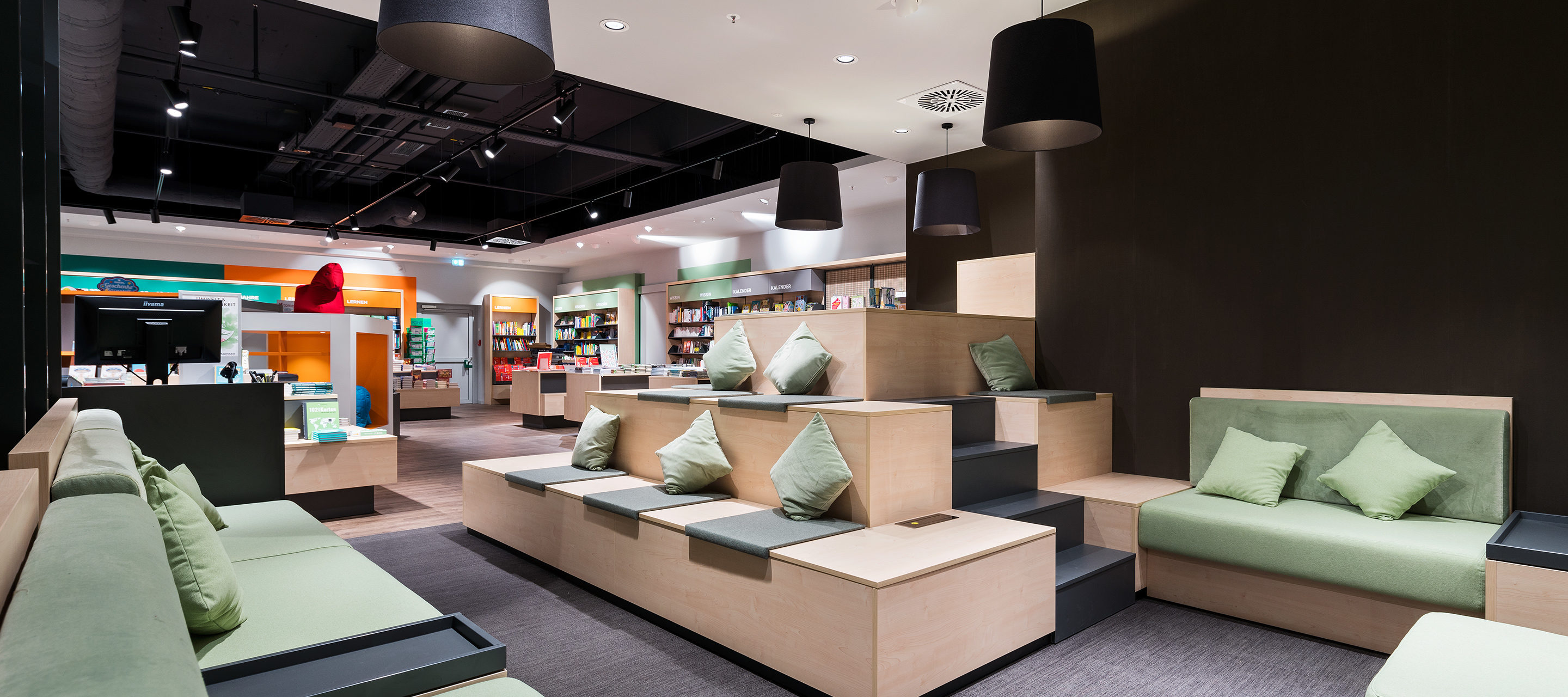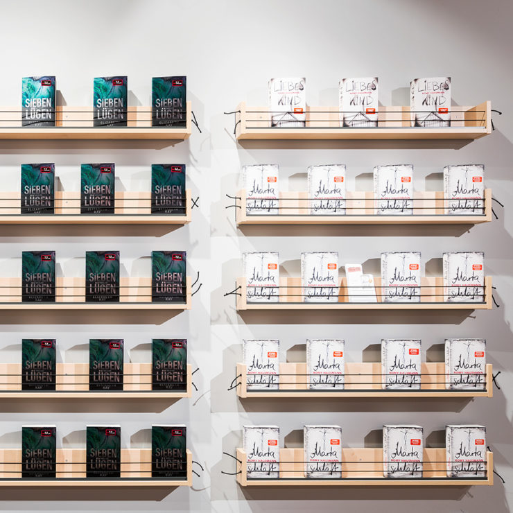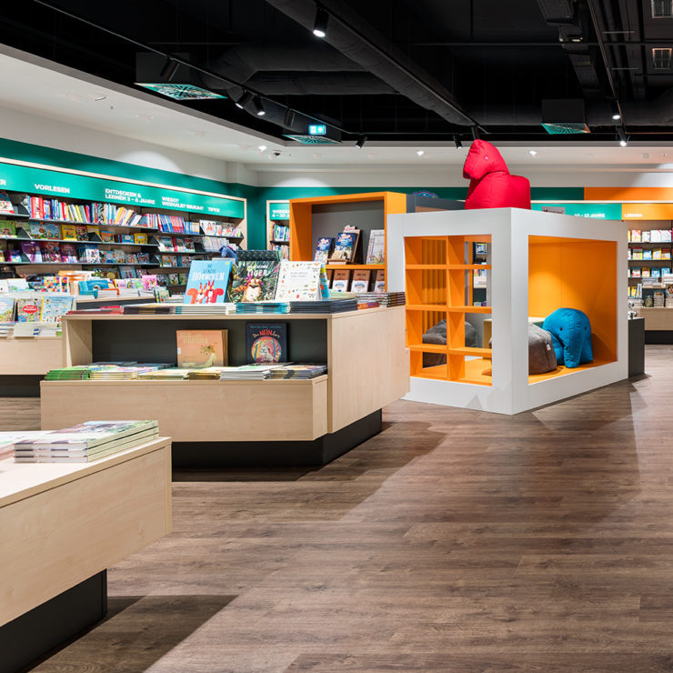 With a new concept, Hugendubel presents the whole world of books. Light wood, long shelves and spacious tables invite customers to browse. Colored markings and conspicuously contrasting highlight walls make it easier to find your way around the comprehensive range. The lounge area with coffee bar is coated in muted colors in velvety nuances, while the play area for children is dipped in bright orange.