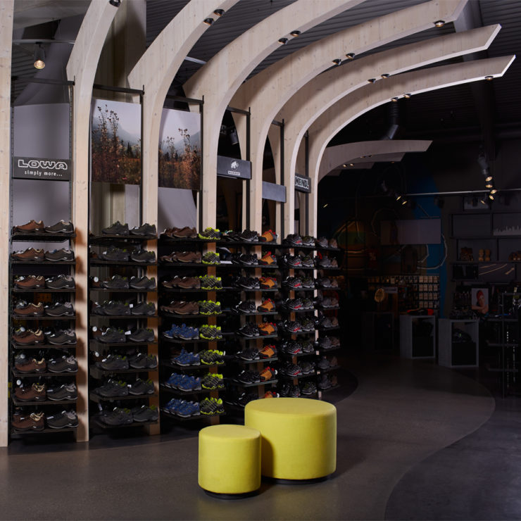 Customers are guided through the sales hall along what looks like a fitness trail. Along the way, you can visit the various sports areas: running and hiking, skiing and snowboarding, as well as the 100 m² kids’ corner. Because the hall itself has no windows, there are individual indoor shop windows that to present the goods. A special highlight are the two running and skiing simulators with real films!