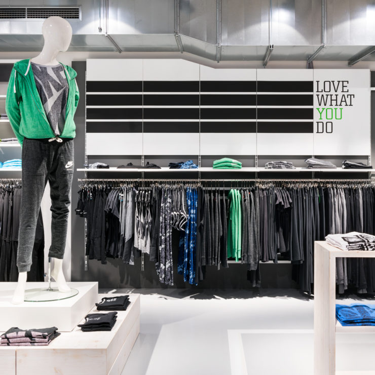 After having renovated the soccer section at Sport Schwab in Ellwangen/Germany we now worked on the ski and textile section. The sports retailer has no more than 115 square metres available to present its entire ski range. This area not only accommodates skis, boards and boots, but also the workshop and the storeroom. In the summer, the latest trainers by the leading brands will be displayed here, which means that there is no room for the winter products. The solution was an intelligent wall rack: during the summer months, black sliding units hide the ski boots, and the light footwear will be presented on shelves that are attached to the sliding units. This way, the tiny space can be used twice!