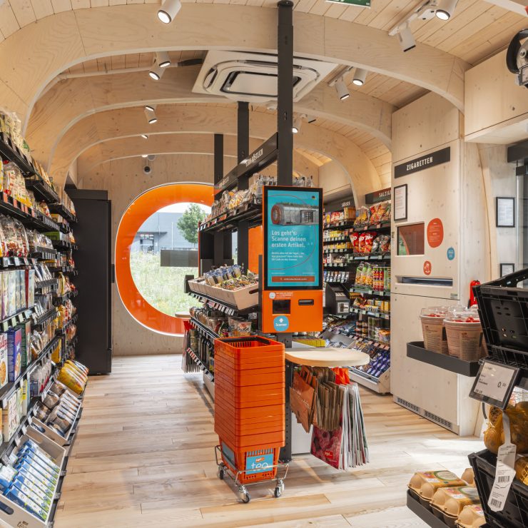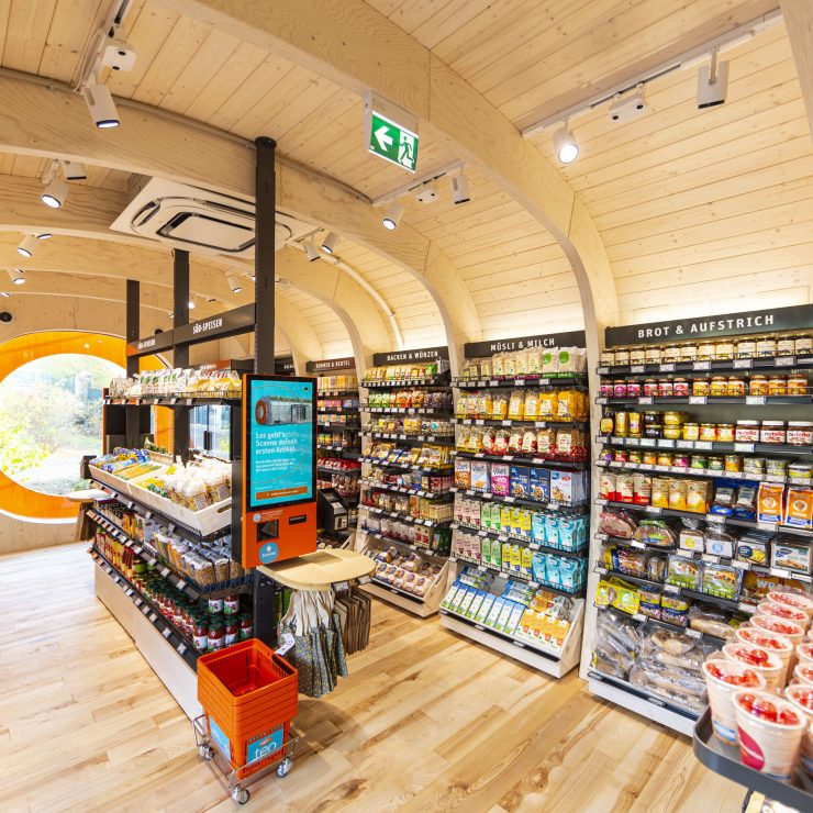 The provision as a whole describes the main feature of our teos – the unique construction. This is the result of a cooperation between two absolute specialists: Holzbau Kiefer and KNOBLAUCH. Together they succeed in implementing the plans of tegut… and the design agency design for human nature in such a way that the complete compact supermarket can be completely assembled and securely packed and loaded directly for transport.