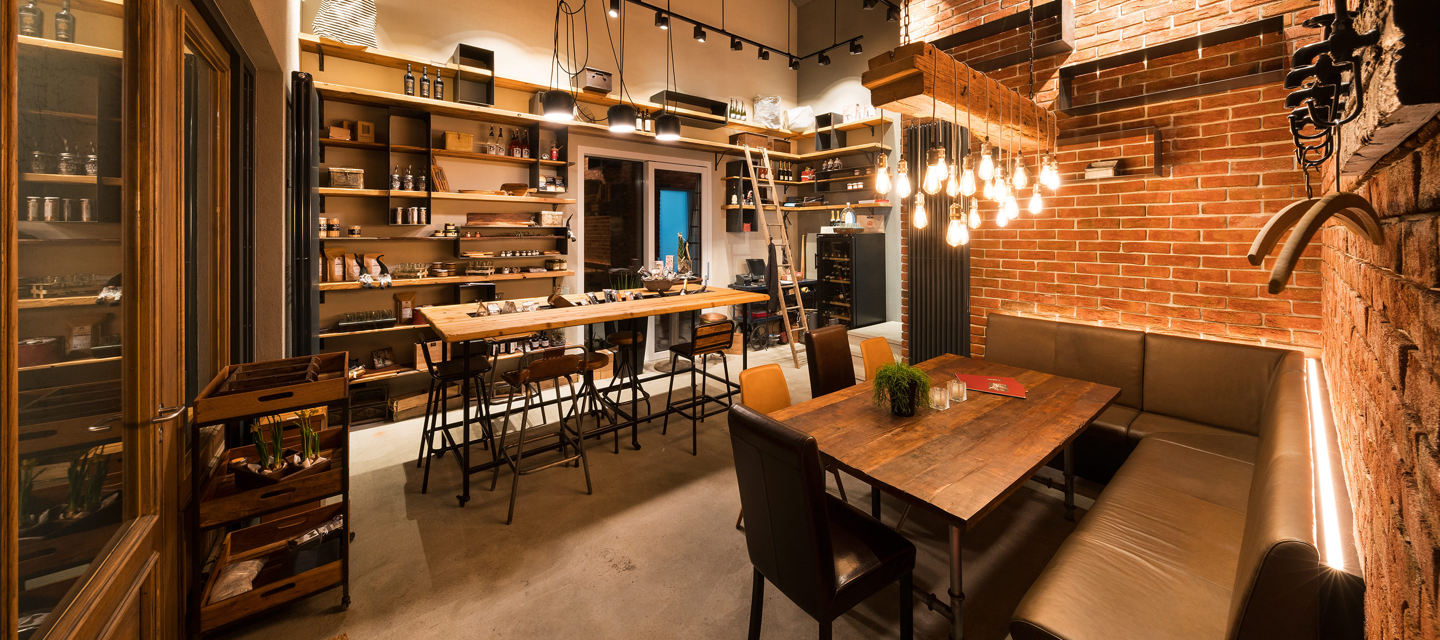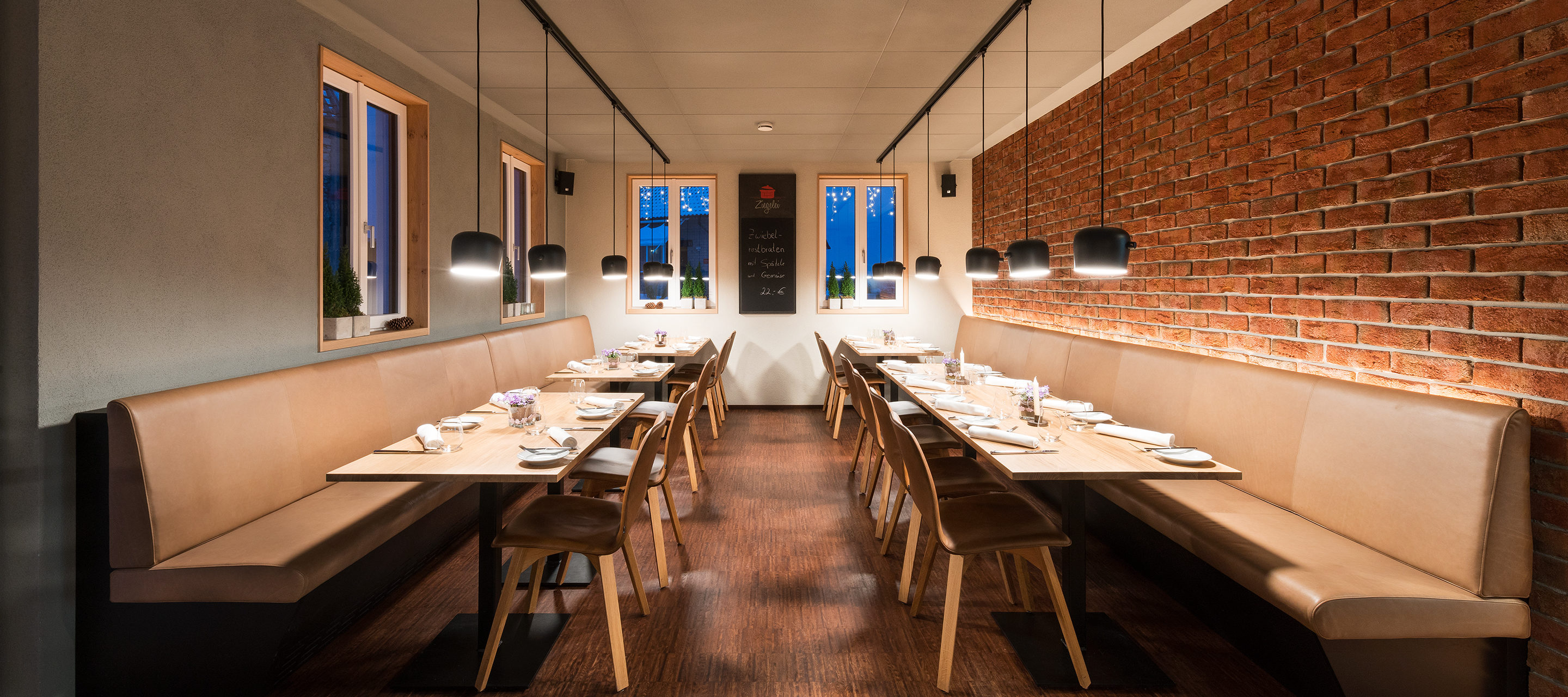 A red brick wall and aged wood round off the design concept. And pay congenial tribute to the name of the restaurant – the German word “Ziegelei” means brickyard in English – and its history. In a homelike atmosphere, 30 people can be accommodated in the restaurant, and 15 individuals can be entertained in the adjacent shop.