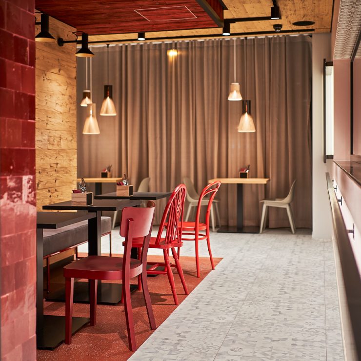 Das Einrichtungskonzept lebt von der Aufgeschlossenheit und Herzlichkeit der Betreiber. Gemeinsam mit ihnen ist ein außergewöhnliches Interieur entstanden, das durch den zentralen roten Kubus getragen wird. Von der Gebäudearchitektur vorgegeben, interpretierten wir ihn als den Kern des Grillrestaurants und im übertagenden Sinn als die Glut im Feuer. So sind die Wände mit roten, handgefertigten Fliesen belegt, die mit ihrer sanften Unebenheit und der speziellen Glasur im Licht changieren und an das Flackern der Flammen erinnern. Auch der Boden um den Kern herum ist rot eingefärbt. Von dort aus verläuft die Farbigkeit über ein warmes Rosa bis in ein modernes Grau und wird von echtem Holz aufgefangen. Das Holz gibt Wärme, erinnert wiederum an das Feuer und ist obendrein noch eine Hommage an die Region Schwarzwald.