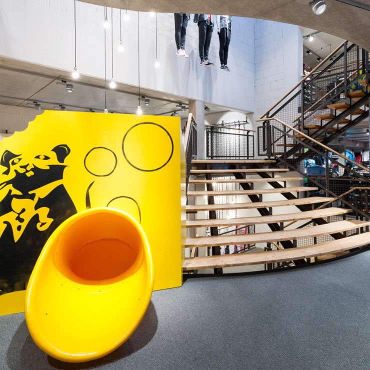 Zwei echte Hinkucker gibt es bei Klöpping: Die Raumhohen Holzbuchstaben zur Markierung des Radbereichs (im Bauch des Großbuchstabens D hat eine gemütliche Sitzecke ihren Platz gefunden….) und die große gelbe Rutschbahn.
