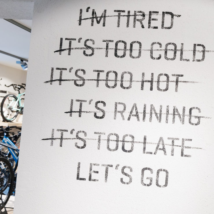 Alte Materialien wurden gekonnt mit neuen Elementen verbunden. Das Konzept des dreistöckigen Sporthauses ist einfach und modular aufgebaut, so dass die Betreiber gemeinsam mit ihrem Team den Großteil des Umbaus selbst in die Hand nehmen konnten. Vor Ort wurden Europaletten zu Tischen gestapelt, Fichtenbretter als Wandverkleidung montiert und Ketten als Kleiderabhängung im Treppenhaus angebracht. Vorgefertigte Schablonen erleichterten die Beschriftung von Möbeln und Wänden mit frechen Sprüchen. In den Toiletten nahmen die Bauherren selbst den weißen Stift zur Hand und bekritzelten mit liebevollen Bildern und Texten die dunklen Wände. Die zum Teil sichtbar verlegten Verkabelungen wirken wie ein eigenes Kunstwerk.