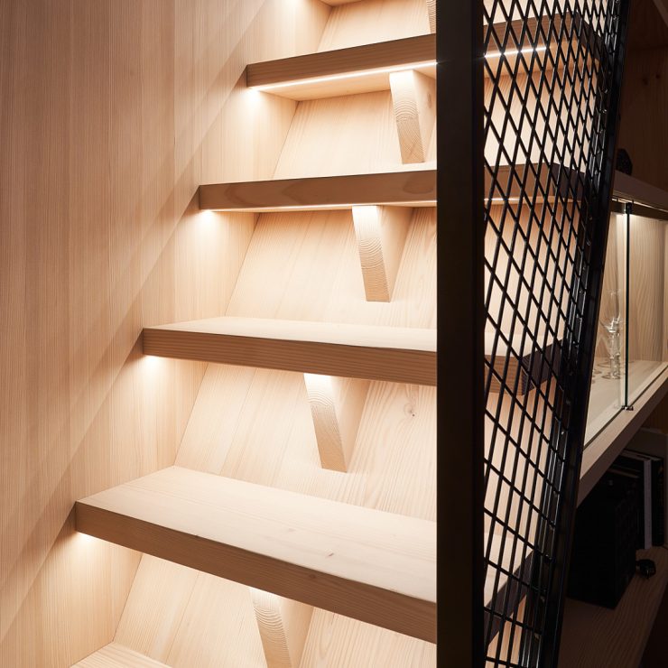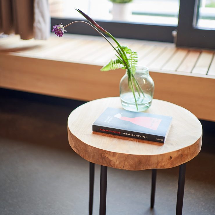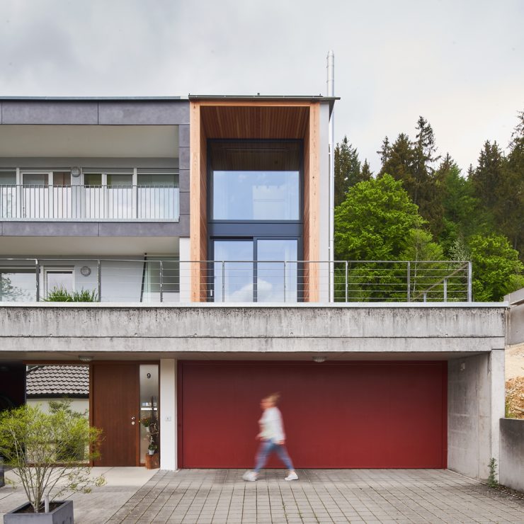 In diesen Überlegungen begleiteten wir die Familie und fanden die perfekte Lösung: Ein schmaler Anbau in Holzständerbauweise, der – dank des leichten Pultdachs –harmonisch in den Bestand integriert erscheint, durch seine teils hölzerne Fassade aus einer horizontalen Lärchenschalung jedoch wie ein eigenständiges Haus anmutet. Einen Eingang sucht man hier allerdings vergeblich. Da das Gästehaus ausschließlich Familie und Freunden vorbehalten ist, werden alle Besucher im Hauptgebäude willkommen geheißen. Nahtlos findet im Inneren der Übergang von alt zu neu statt. Das Gästebad und das Entrée mit eingepasstem Arbeitsplatz befinden sich im Bestandsgebäude und stellen den einzigen Zugang zum Neubau dar. Deswegen sprechen beide Räume bereits dessen innenarchitektonische Sprache: Freundliche Farbtöne, natürliche Materialien und geradliniges Mobiliar zeichnen den heimeligen Charakter des Refugiums.