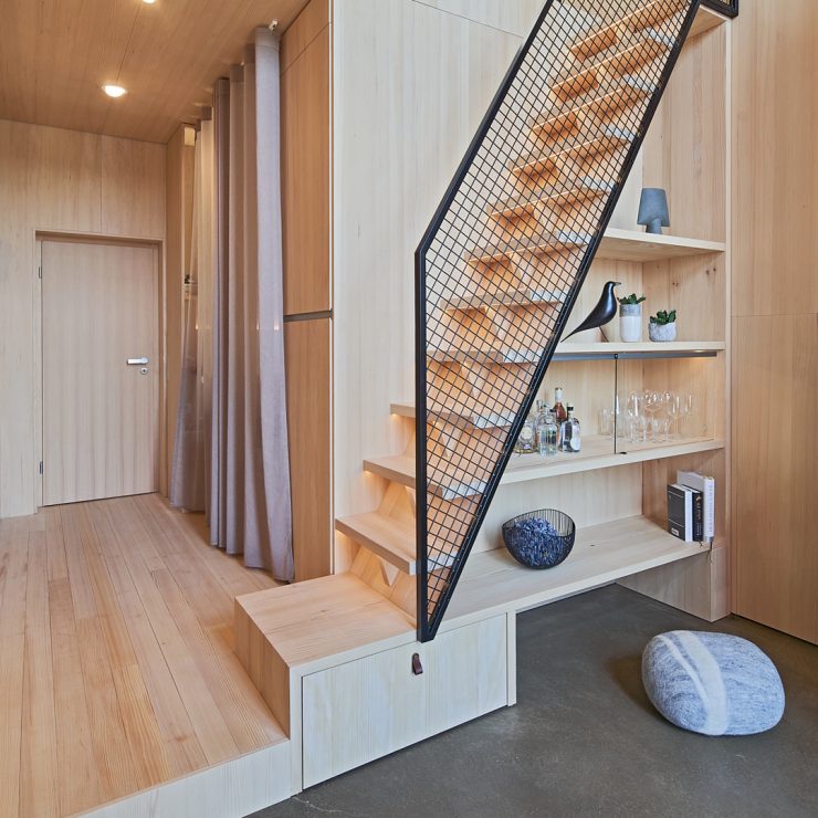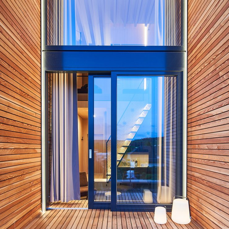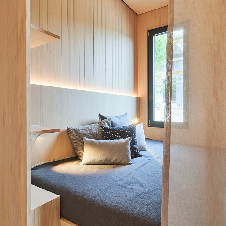 Der Anbau selbst mit einer Grundfläche im Erdgeschoss von gerademal 20 Quadratmetern ist der perfekte Rückzugsort. Neben der Koje mit Doppelbett, die mit einem Vorhang vom Wohnraum abgetrennt ist, befinden sind auf der ersten Ebene (ca. 8 m²) zwei weitere Betten und in der zweiten Ebene (ca. 5 m²) noch ein fünfter Schlafplatz. Zur Fensterfront hin ist der Wohnbereich, ausgestattet mit einem kuscheligen Sessel und Kaminofen, auf einer Höhe von über fünf Metern bis unters Dach geöffnet. Die bodentiefen Fensterelemente öffnen sich zur Terrasse hin, die durch einen Holzrahmen in die Fassade eingegliedert ist. Egal zu welcher Jahreszeit, ein Kurzaufenthalt im Gästehaus verspricht Muse und Zerstreuung. Es sind die wenigen und zurückhaltenden Materialien, die gleichermaßen Ruhe und Behaglichkeit ausstrahlen: Weißtanne an Wänden, Böden und Einbauten, Sichtestrich im Wohnbereich und große sandfarbene Fliesen im Bad. Eine Küche gibt es im Gästehaus übrigens nicht. Gekocht und gegessen wird gemeinsam im Familiendomizil.