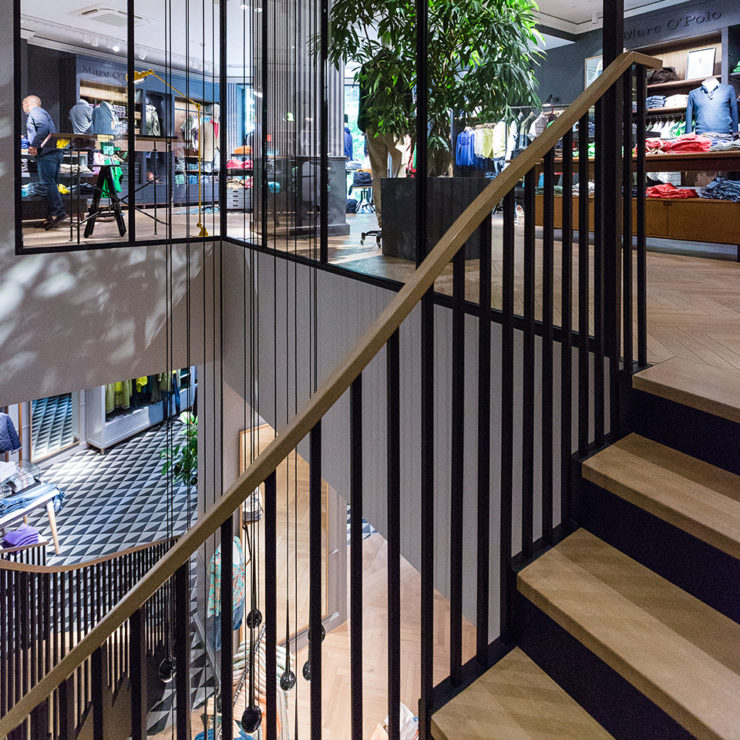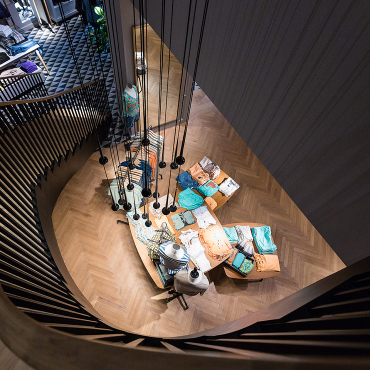 Eichenparkett, Steinboden und Kassettentäfelung an den Wänden schaffen Atmosphäre. Dazu kommen hochwertige verarbeitete Materialien. Die Choreographie beider Stockwerke mit Atelier, Atrium, Salon und begehbarer Ankleide erinnert an moderne und geräumige Altbauwohnungen. Kunden verwandeln sich in Besucher, die zwanglos durch Räume flanieren, hier etwas entdecken und sich dort wiedererkennen.
