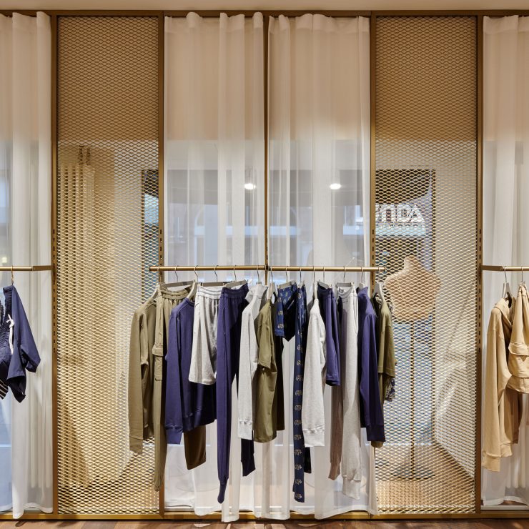 Andere Spezialisten wie Watercult, Falke oder Naturkosmetik-Hersteller Greenglam ergänzen dafür das eigene Sortiment. Nach Läden in Heidelberg und Bremen, die Anfang 2022 eröffneten, gibt es diese Shopping Symbiose seit April auch im bisher größten mes ami-Store, in Aschaffenburg. Hier wird gleich von außen klar: Irgendwie ist es mey, aber doch ein bisschen anders. So umrahmen Schilder den Eingangsbereich, die mit goldenem Streckmetall das X aus dem mes ami-Logo aufgreifen. Ein Material, das die eher weiche Marken Identität sinnvoll bereichert.