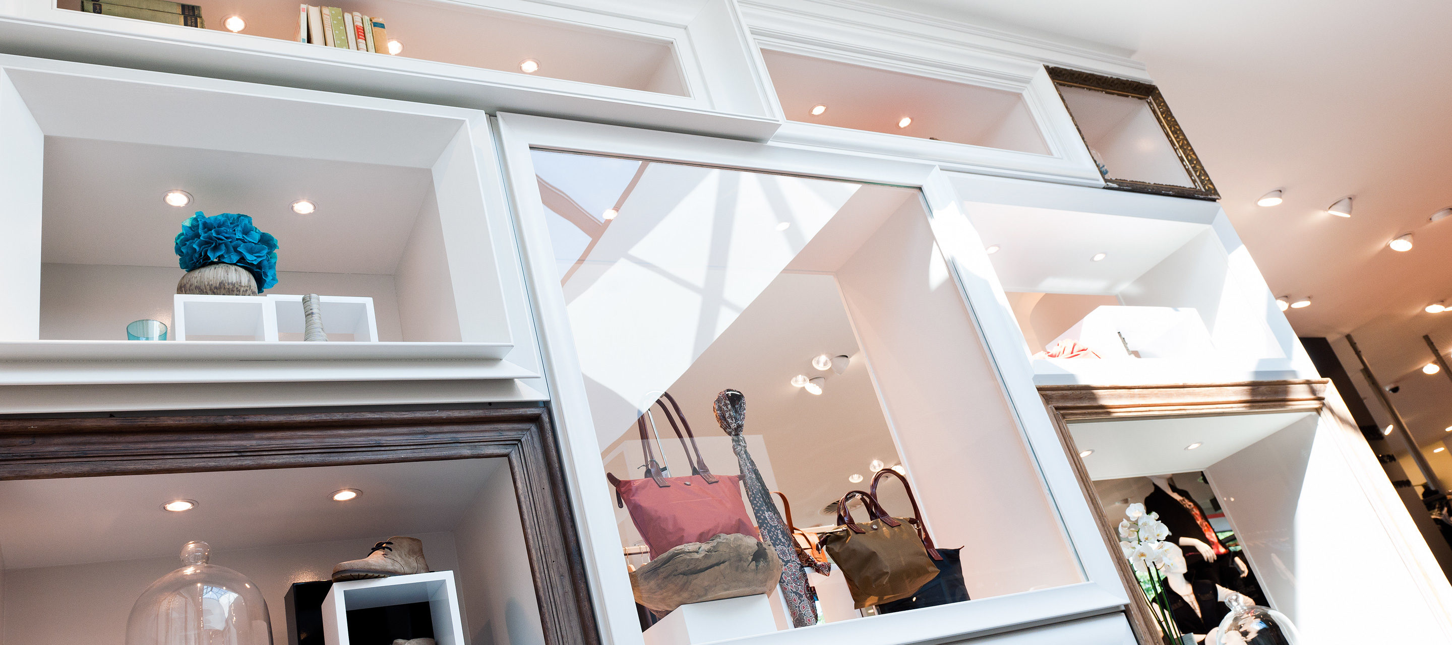 Die Anspielung an die 150-jährige Geschichte des Modehaus Stock spiegelt sich in der kompletten Inneneinrichtung. Bilderrahmen wo man hinschaut. Selbst im Luftraum der Treppe sind rund drei Meter hohe Rahmen aufeinandergestellt. Antiquitäten werden als zusätzliche Verbindung von Tradition und Moderne in die ansonsten schlichte Einrichtung gespickt.