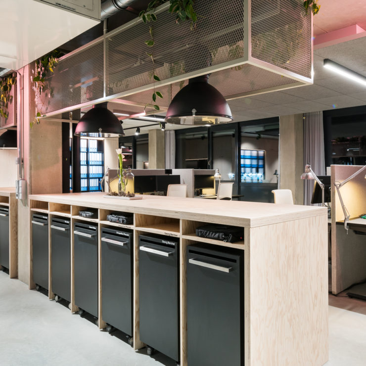 Die gedeckten Farben ziehen sich durch das ganze Büro mit 25 flexiblen Arbeitsplätzen. Lediglich im Aufenthaltsbereich setzt ein knallrotes Pflanzgitter einen farbigen Akzent. Üppige Grünpflanzen dienen sowohl dem Sichtschutz als auch dem Raum- und Wohlfühlklima in der ansonsten schlichten Umgebung. Für die Pausen steht den Mitarbeitern ein Tischkicker zur Verfügung. Hochwertige Designermöbel runden die Einrichtung ab: Galvanitas Chairs in den Besprechungsräumen, Beistelltische, Garderobe und Barhocker von Hay, Hängeleuchten und Loungechair von Zuiver sowie Rollcontainer von Bisley.